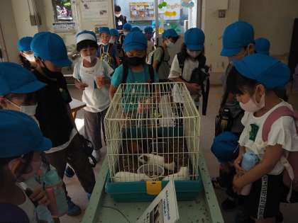 見上げるほどのキリンの背の高さにびっくりしながら、ムシャムシャと餌を食べる様子を観察しました。モルモットのケージの前では、「かわいいね。」「だっこしてみたい。」と、友達と話をしていました。