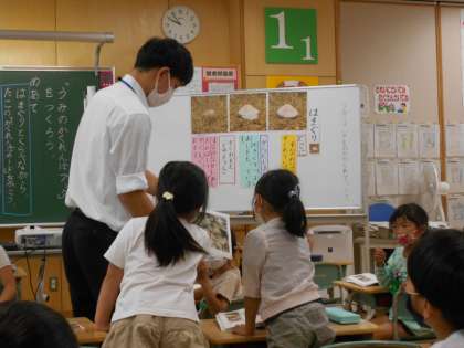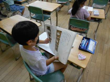 1年生は、国語「うみのかくれんぼ」の学習をがんばっています。生き物同士を比べながら、説明文の内容を詳しく読み取っています。