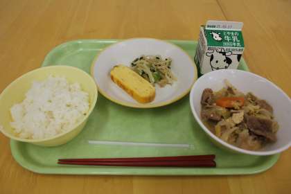 今日の献立は、ご飯、厚焼き卵、おひたし、すきやき、牛乳です。