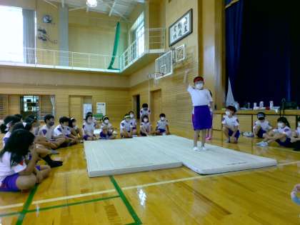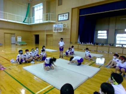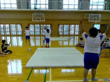 体育科では、マット運動を行っています。1・2組は他のグループの演技のよさを見付け、自分のグループに生かせるところはないか考えながら学習を進めました。