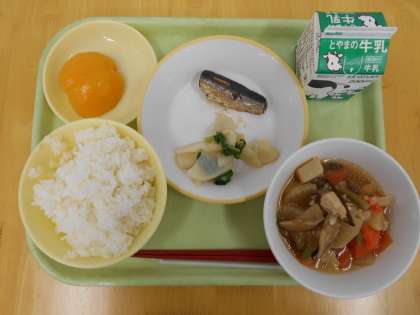 今日の献立は、ご飯、だいこんととり肉のうま煮、イワシのしょうがあじ、かぶのいろどり、ももかん、牛乳です。