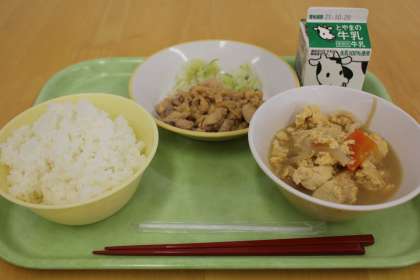 今日の献立は、ご飯、あっさりチキン、ゆでキャベツ、唐揚げの錦とじ、牛乳です。