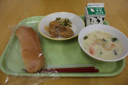 今日の献立は、コッペパン、フライドチキン、茎わかめサラダ、ほたてのクリーム煮、牛乳です。