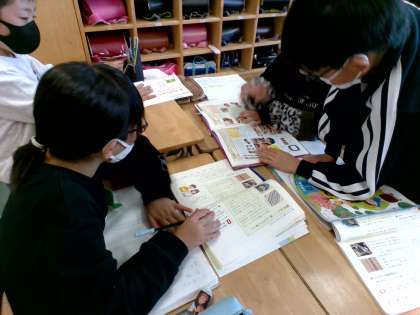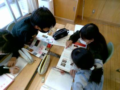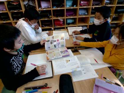 「世界にほこる和紙」を学習した4年生は、次に自分たちで伝統工芸について調べ、リーフレットにまとめようとしています。今日は、くわしく調べて、班ごとに整理してまとめています。