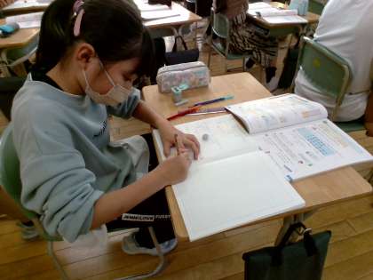 「分配」「交かん」「結合」のきまりを用いると、早く簡単に正確に計算できることを知った4年生は、いろんなきまりを用いて工夫し手計算できるように頑張っています。