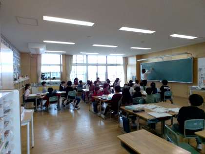 理科「太陽の光を調べよう」の学習では、かがみではね返した日光はどのように進むかを予想し、実験方法を確認しました。
