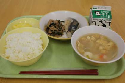 今日の献立は、ご飯、さわらの塩焼き、しらたきのピリ辛炒め、白玉汁、カットパイン、牛乳です。
