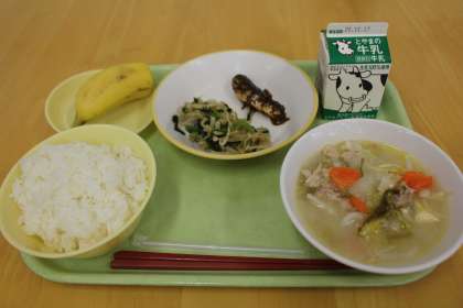 今日の献立は、ご飯、塩こうじ鍋、いわしの土佐煮、おひたし、バナナ、牛乳です。