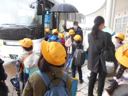 朝から冷たい雨が降るあいにくの天気となりましたが、元気にバスに乗って出発しました。