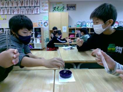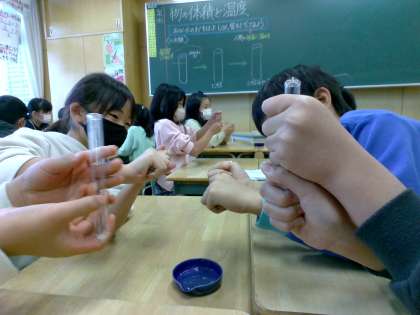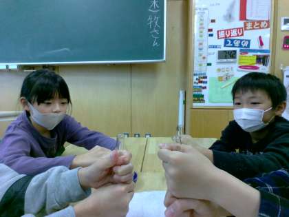 試験管に石鹸水で膜を貼り、手で握るととどうなるかを観察しました。