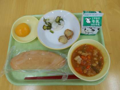 今日の献立は、米粉コッペパン、ポークビーンズ、ホタテの香味焼き、かぶのサラダ、ももかん、牛乳です。