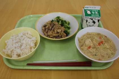 今日の献立は、麦ご飯、スタミナレバー丼、ゆでブロッコリー、中華かきたまスープ、牛乳です。
