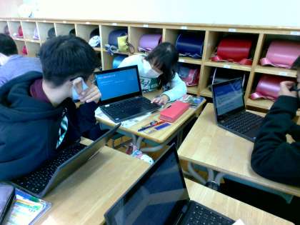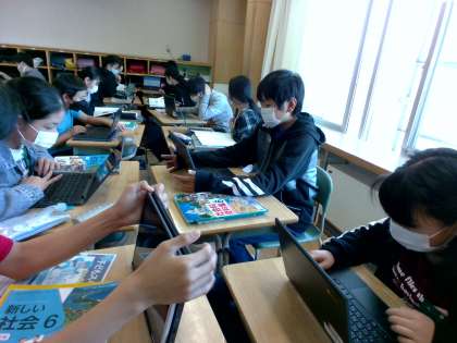社会科では、江戸時代の町人の文化について調べたことをまとめ、グループの友達に紹介し合いました。分かったことから、浮世絵や歌舞伎などのキャッチフレーズを作り、江戸時代の文化について理解を深めました。