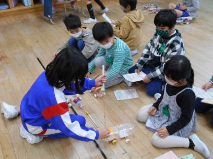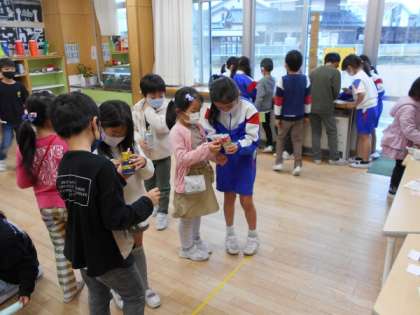 2年生に招待された「うごくおもちゃランド」に行きました。ストローアーチェリーやびゅんびゅんカー等、面白いおもちゃがたくさんで、2年生が優しく遊び方を教えてくれました。スタンプを押してもらったり、景品をもらったりして、大喜びの1年生でした。