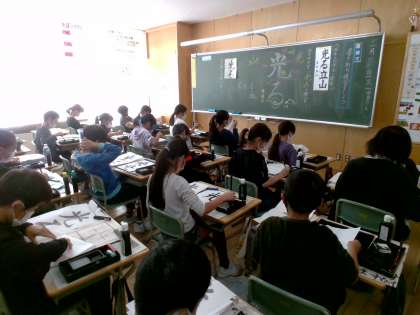 今年度4年生が書初で挑戦する字は、「光る立山」です。今日は「光る」の練習を行いました。