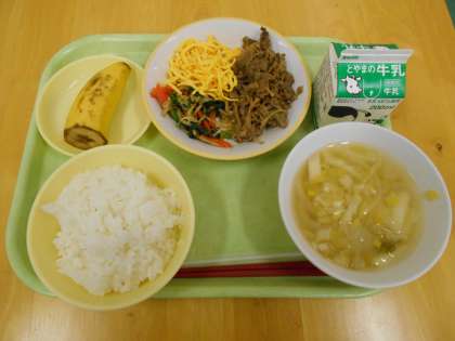 今日の献立は、ごはん、ビビンバ(焼き肉 ナムル 錦糸卵)、みそ汁、バナナ、牛乳です。