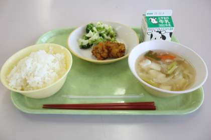 今日の献立は、ご飯、ポークパコラ、そえ野菜、かぶのスープ、牛乳です。