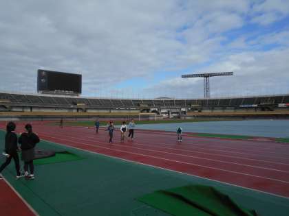 昼食後は、競技場を特別に走らせて頂きました。天気もよく、いつもとは違う場所で走ることができ、嬉しそうな子供たちでした。