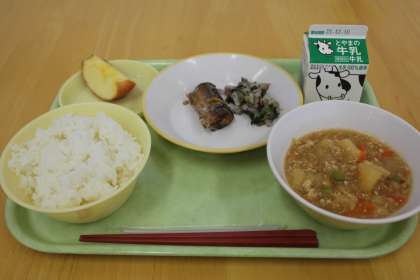 今日の献立は、ご飯、さんまの生姜味、ゆかり和え、じゃがいものそぼろあん、りんご、牛乳です。