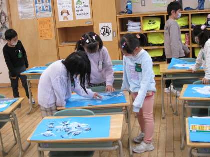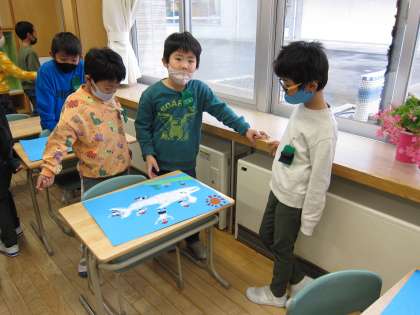 「『くじらぐも』のふわふわした感じがいいね」「町や村が描いてあって、子供たちが上から見た感じがわかっていいね」など、友達の描すてきなすてきなところをたくさん見付けていました。