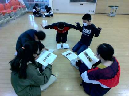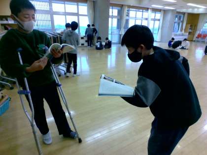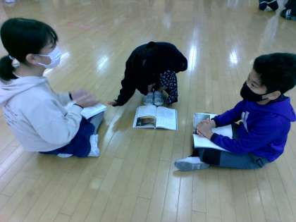 国語科では日本の伝統文化である狂言を学習しています。「柿山伏」をペアで役割を決め音読することで、その当時の言い回しに親しんでいます。