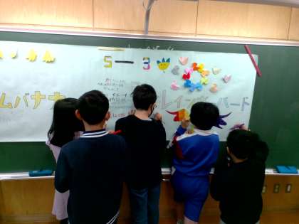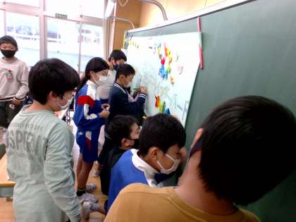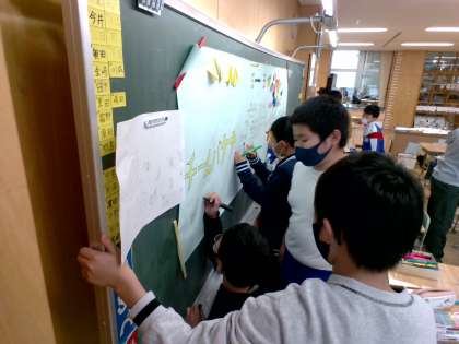 本日の長縄大会に出場するチームを応援するために、横断幕をつくりました。友達を応援しようとする姿がすてきです。