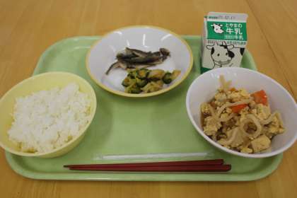 今日の献立は、ご飯、親子煮、小あじのから揚げ、はくさいひたし、牛乳です。