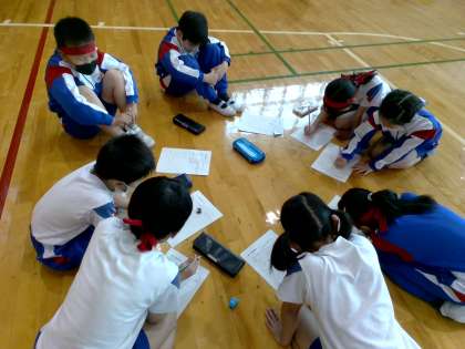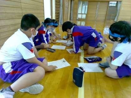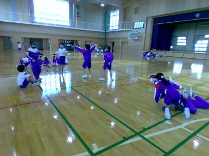 体育科「表現運動」の学習では、グループごとに流れや動きを考えました。前回、他のグループの動きを見て感じたことを生かして、「もっと動きを増やそう」「違う流れにしたほうが面白くない?」と話し合っていました。
