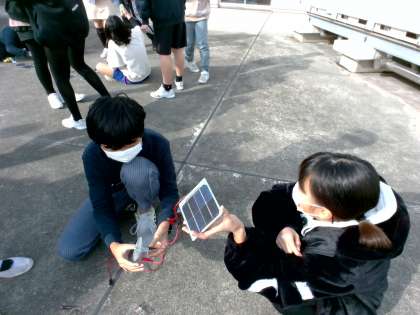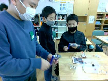理科「電気と私たちのくらし」の学習では、自分たちで発電できるかどうかを確かめました。手回し発電機や太陽電池をモーターや豆電球につなぎ、発電できたかどうか調べました。