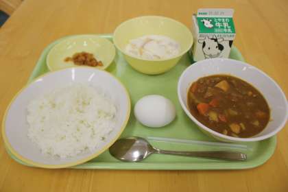 今日の献立は、ご飯、カレーライス、福神漬、ゆで卵、フルーツヨーグルト、牛乳です。