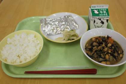 今日の献立は、ご飯、さばの銀紙焼き、かぶの彩り、大豆の磯煮、牛乳です。