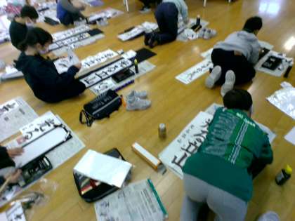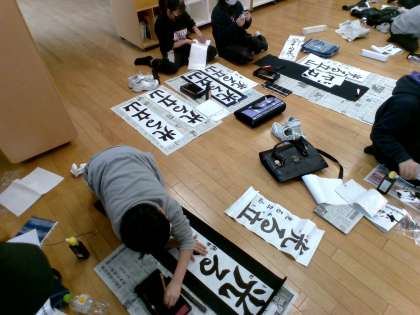 3学期始業式に行われる、書初大会に向けて練習を行っています。大きな紙に、バランスよく太く書くように意識していました。