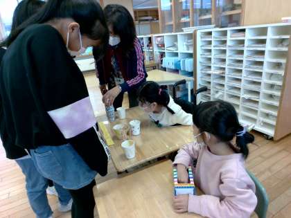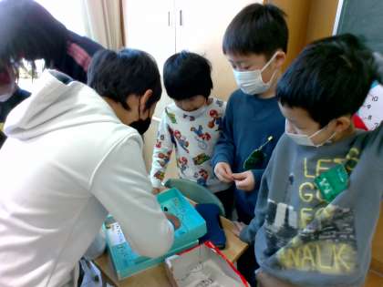 休み時間に、1年生が招待してくれた「おもちゃランド」に参加しました。どのお店も、工夫したおもちゃがあり、いっしょに楽しく遊びました。