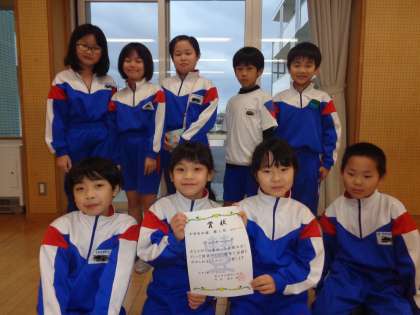 2−2赤団「ファイヤーレッド」チームが232回跳んで、1位を取ることができました。賞状をもらいうれしそうな赤団の子供たち。せっかくなので、記念撮影をしました。