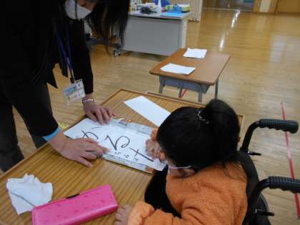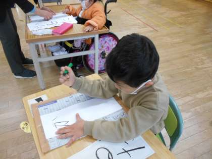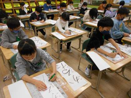 始業式が終わった後は、書初大会です。先生の話をよく聞いてから、3枚揮毫しました。