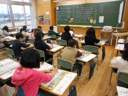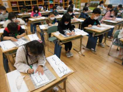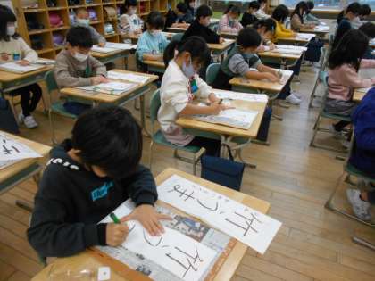 始業式が終わった後は、書初大会です。先生の話をよく聞いてから、3枚揮毫しました。