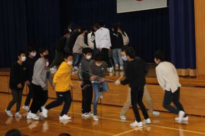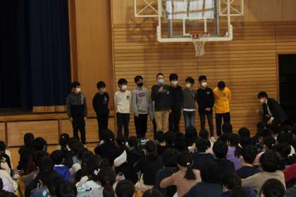 第3学期始業式の後、16日(日)の富山市小学生縄跳び交流大会に学校代表として出場する6年児童3チームの走行会を行いました。大会に向けての決意とともに縄跳びの腕前を全校児童の前で披露してくれました。