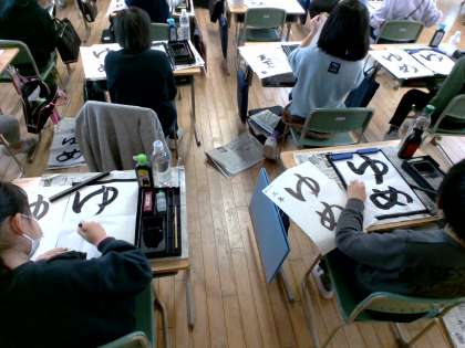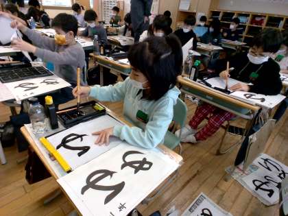書写の学習では、「ゆめ」を書きました。漢字に比べて、平仮名は丸みがあることに気付き、丸みのある「ゆめ」になるよう筆使いに気を付けて書いていました。