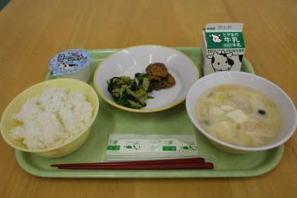 今日の献立は、ご飯、ちくわのカレー揚げ、しょうがひたし、豆乳汁、ヨーグルト、牛乳です。