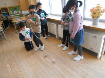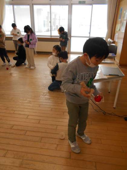 昔遊び名人を目指して、練習を始めました。けん玉、お手玉、こまなど、いろいろな昔遊びに挑戦しています。