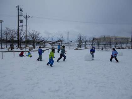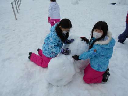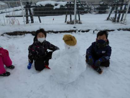 今日も雪遊びです!プレイグラウンドにはたくさんの雪だるまができあがりました。雪合戦もとても白熱した戦いとなっていました。
