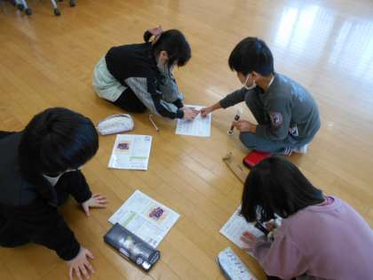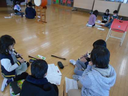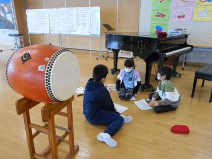 音楽の時間には、リコーダーのグループ練習をしたり、演奏に合わせて太鼓のリズムを作ったりしていました。