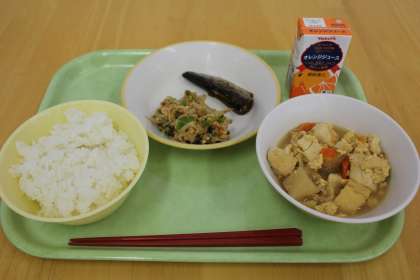 今日の献立は、ご飯、いわしの梅煮、いり大豆和え、唐揚げの錦とじ、オレンジジュースです。