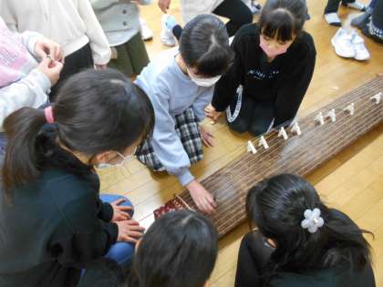 音楽科では、琴の弦をそれぞれが弾いてみて、音の響きを確かめていました。