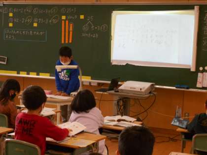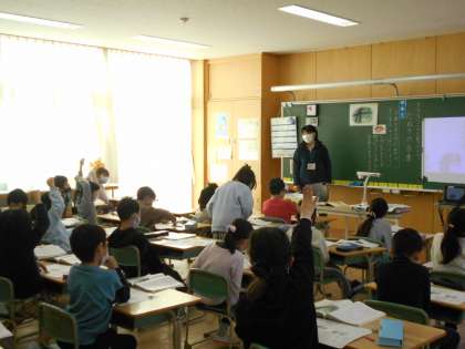 国語では「たぬきの糸車」を学習していました。挿絵や文をもとに、登場人物の気持ちを想像していました。算数では、書画カメラでノートを写して、自分の考えを説明していました。