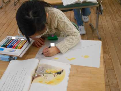 「たぬきの糸車」の好きなところを選んで、文を写して絵を描きました。