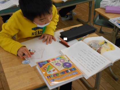 「たぬきがおかみさんの糸車を回す様子を見て、目玉を回しているところがかわいいから好きだな。」「たぬきがぴょんぴょこ踊りながら帰っていくところが面白いから好きだな。」など、子供たちは「たぬきの糸車」のお話の世界に浸りながら描いていました。