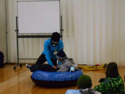 こどもの村職員の方々から説明を受け、スノーチューブそり体験を行いました。最初は雪山の高さに怯えていた子どもたちも回数を重ねるごとに勢いよく滑り出し楽しむ姿が見られました。