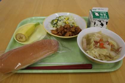 今日の献立は、コッペパン、鶏肉のマーマレードソースがけ、フレンチサラダ、キャベツスープ、バナナ、牛乳です。