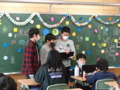 係を中心にして学級集会が行われました。休み時間等を活用して準備した成果が楽しさに表れた集会でした。休んでいる友達のことを考えて、活動の様子を写真におさめたり、動画に保存したりする姿も見られました。